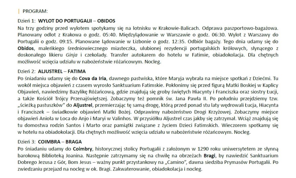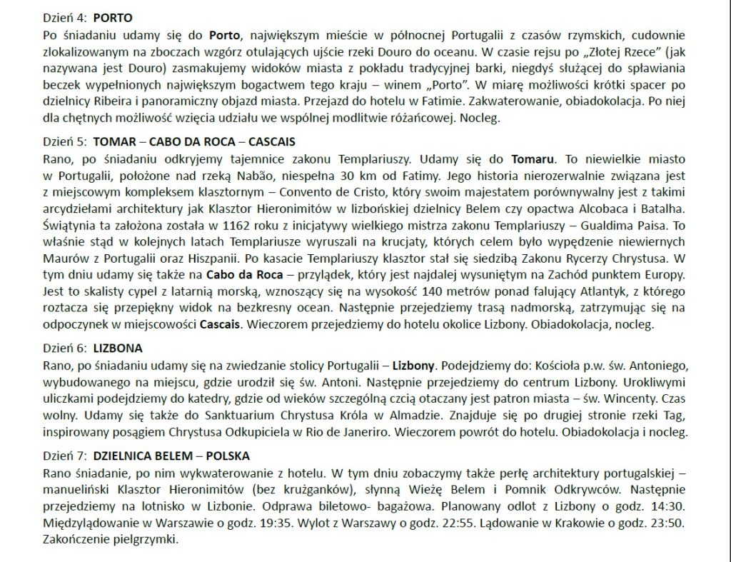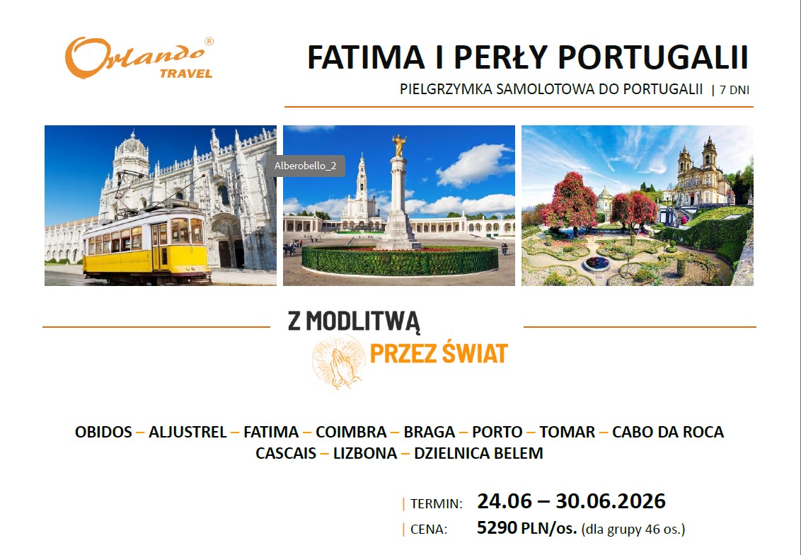 Fatima i Perły Portugalii – Pielgrzymka samolotowa 7 dni (24-30.06.2026)2026-03-11Napisał Parafia Narodzenia Najświętszej Maryi Panny w Myślenicach Opis pielgrzymki do pobrania (pdf)