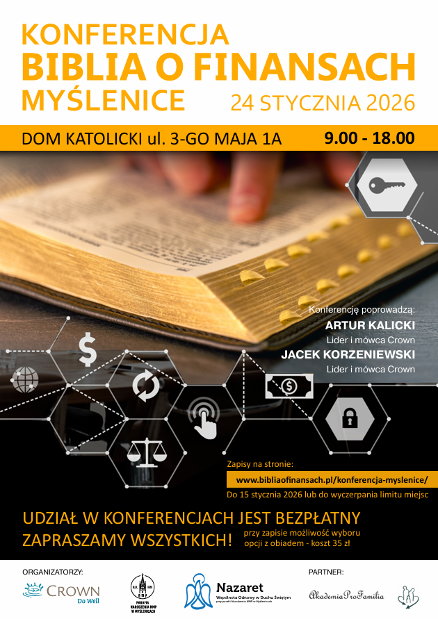 Konferencja „Biblia o finansach” odbędzie się 24 stycznia 2026 r. w Domu Katolickim przy ul. 3 Maja 1A w Myślenicach. Spotkanie potrwa od 9.00 do 18.00. Poprowadzą je Artur Kalicki i Jacek Korzeniewski, liderzy i mówcy Crown.