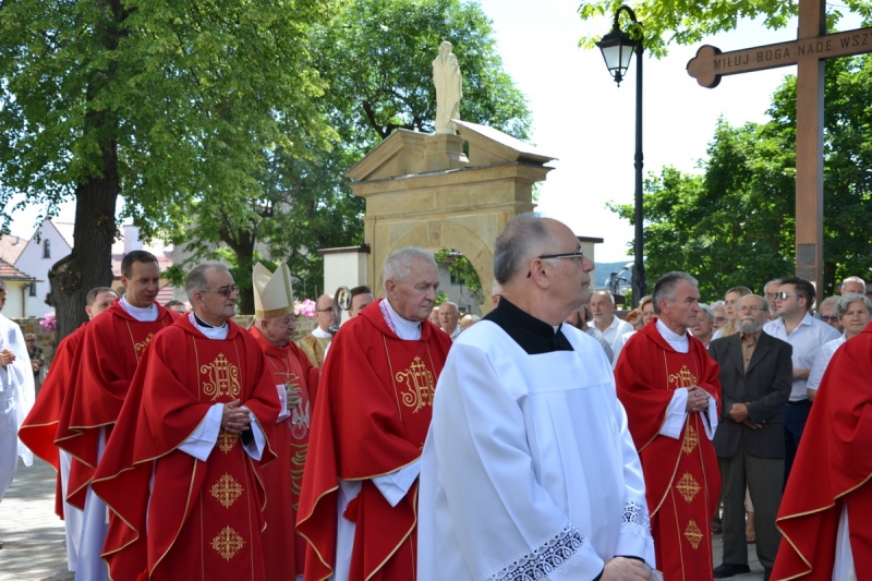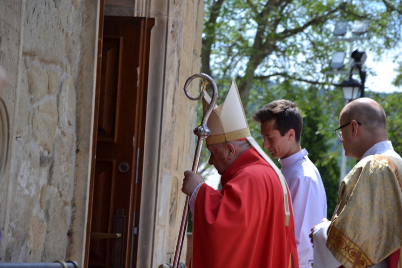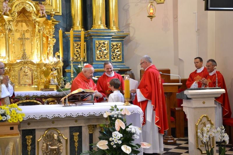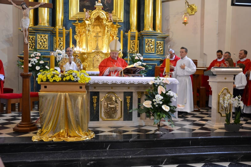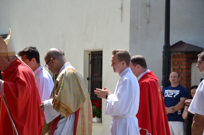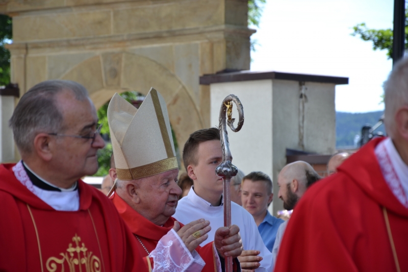Gdy dzwon na wieży wybił godzinę 11:00, spod zakrystii Sanktuarium w stronę ołtarza polowego wyruszyła procesja. Na Papieża, w znaku relikwii, oczekiwali już parafianie, czciciele spoza wspólnoty, przedstawiciele władz samorządowych i zaproszeni goście. Tam też ks. proboszcz Zdzisław Balon przywitał kardynała, który, nim rozpoczął obrzęd poświęcenia, odwołał się do wydarzeń z 1969 roku oraz wyraził uznanie wobec poziomu wykonania prac rewitalizacyjnych wokół kościoła. Celebrans określił wydarzenie mianem historycznego w kontekście Roku Jubileuszowego, instalacji relikwii oraz oddania do użytku odnowionego placu kościelnego wraz z okalającymi go murami.