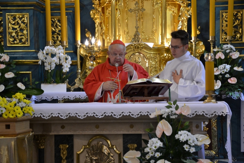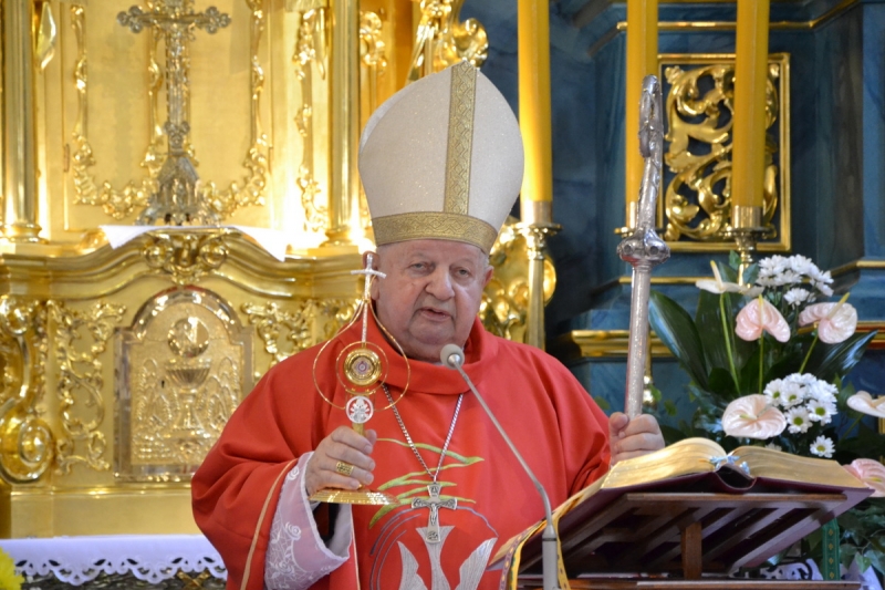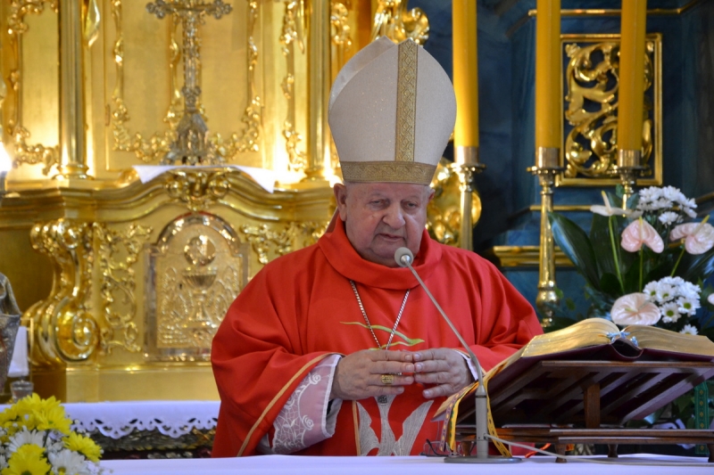 Przykładem niestrudzonego świadka i głosiciela Ewangelii, kardynał Stanisław Dziwisz uczynił papieża Jana Pawła II, a wcześniej biskupa i kardynała Karola Wojtyłę, który – (…) znał całą archidiecezję. Przemierzał ją wzdłuż i wszerz. Znał wszystkie wspólnoty. Jakże bliskie był mu także Myślenice, do których wielokrotnie przyjeżdżał, a przez które jeszcze częściej przejeżdżał podróżując do parafii położonych na południu – podkreślał kardynał. Kończąc słowo, odwołał się także do zbliżających się uroczystości wieńczących Rok Jubileuszowy – 24 sierpnia przypada 50 lat od koronacji Obrazu Matki Bożej Myślenickiej. Wielu z Was pamięta ten dzień. Pamiętam, gdy ksiądz kardynał zakładał złote korony na skronie Matki Bożej i Jej Boskiego Syna. (…) Przez tę koronację cały nasz naród dziękuje Matce Bożej za Jej tysiącletnie pielgrzymowanie z nami – podsumował kardynał, a po Mszy Św. przyjął zaproszenie na kontynuację tego pielgrzymowania, czyli Eucharystię Jubileuszową 24 sierpnia o godzinie 11:00 na Rynku w Myślenicach.