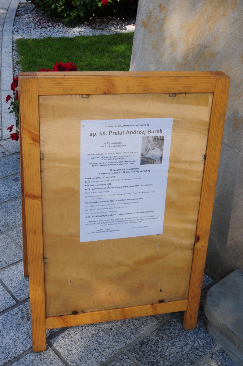 W poniedziałek 5 września odbyły się w naszym Sanktuarium uroczystości pogrzebowe śp. ks. Prałata Andrzeja Burka, który był proboszczem naszej parafii w latach 2010-2015. Wcześniej był proboszczem i budowniczym kościoła MB Różańcowej w Krakowie-Piaskach Nowych. Jako wikariusz pracował w parafiach Barwałd, Bielany, Rajcza i Łapanów. Odszedł do Pana w 72 roku życia i w 47 roku kapłaństwa.